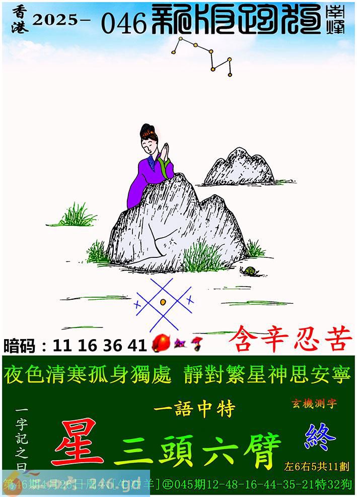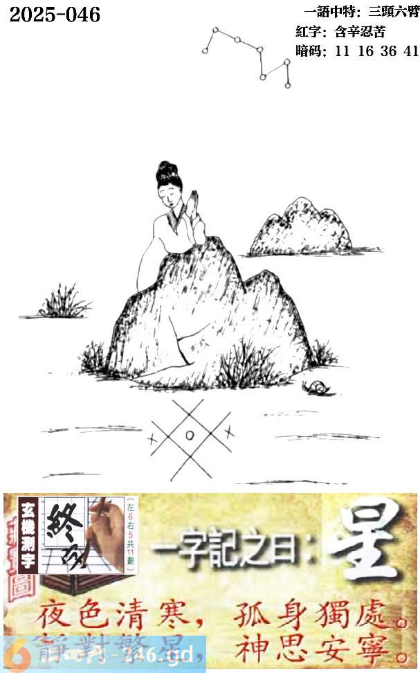 046期跑狗一字記之曰:【星】 夜色清寒,孤身獨處。 靜對繁星,神思安寧。 玄機測字:《終》 一語中特:三頭六臂