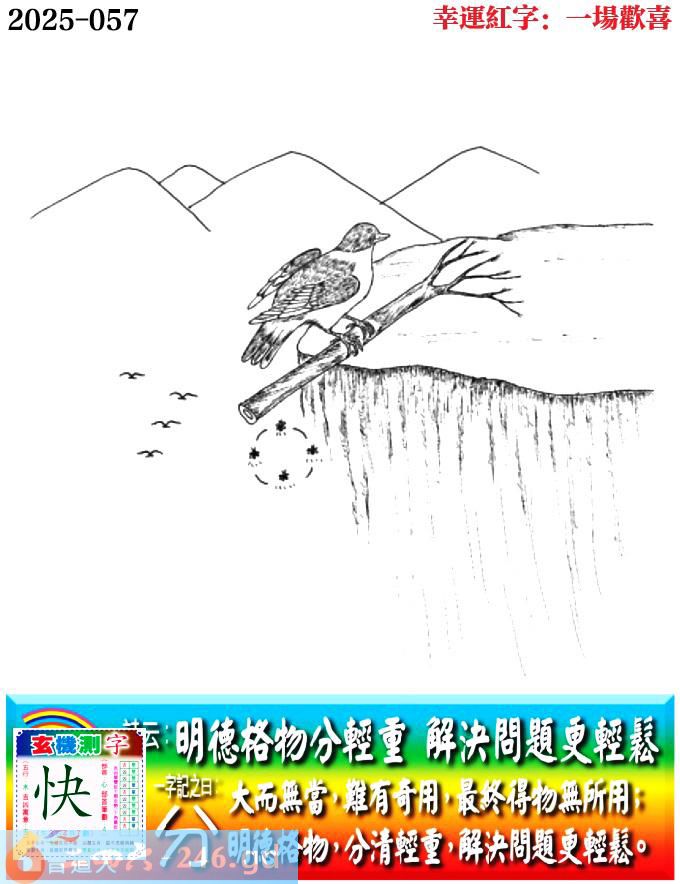 057期老版跑狗一字記之曰:【分】 詩雲:明德格物分輕重,解決問題更輕鬆。 大而無當,難有奇用,最終得物無所用; 明德格物,分清輕重,解決問題更輕鬆。 玄機測字:《快》