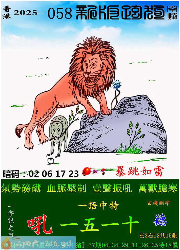 058期跑狗一字記之曰:【吼】 氣勢磅礴,血脈壓制。 壹聲振吼,萬獸膽寒。 玄機測字:《德》 一語中特:一五一十