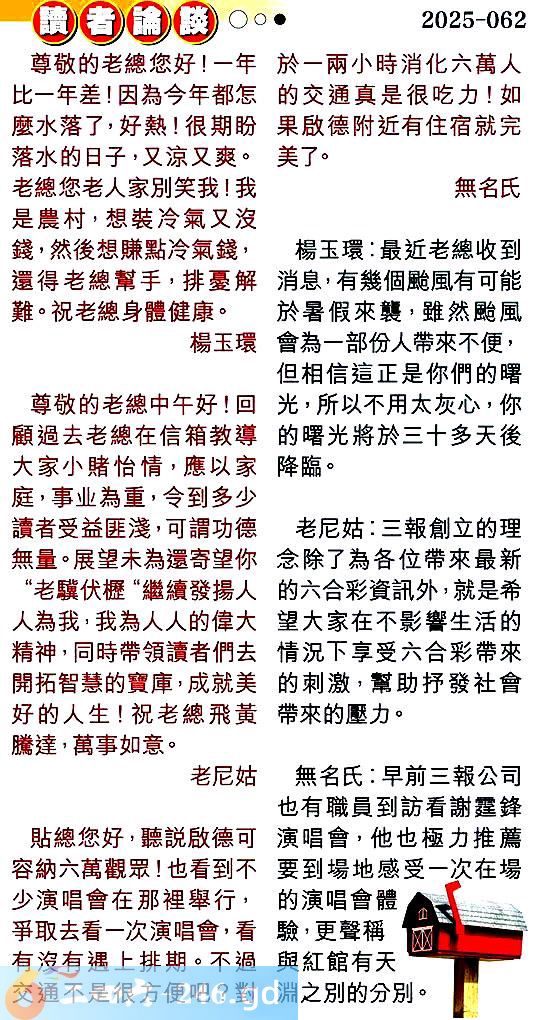 第零六二期讀者論談 1.尊敬的老總您好!一年比一年差!因為今年都怎麼水落了,好熱!很期盼落水的日子,又涼又爽。老總您老人家別笑我!我是農村,想装冷氣又沒錢,然後想賺點冷氣錢,還得老總幫手,排憂解難。祝老總身體健康。楊玉環 〖楊玉環〗:最近老總收到消息,有幾個颱風有可能於暑假來襲,雖然颱風會為一部份人帶來不便,但相信這正是你們的曙光,所以不用太灰心,你的曙光將於三十多天後降臨。 2.尊敬的老總中午好!回顧過去老總在信箱教導大家小賭怡情,應以家庭事业為重,令到多少讀者受益匪淺,可謂功德無量。展望未為還寄望你“老驥伏櫪“繼續發揚人人為我,我為人人的偉大精神,同時帶領讀者們去開拓智慧的寶庫,成就美好的人生!祝老總飛黃騰達,萬事如意。老尼姑 〖老尼姑〗:三報創立的理念除了為各位帶來最新的六合彩資訊外,就是希望大家在不影響生活的情況下享受六合彩帶來的刺激,幫助抒發社會帶來的壓力。 3.貼總您好,聽說啟德可容納六萬觀眾!也看到不少演唱會在那裡舉行,爭取去看一次演唱會,看有沒有遇上排期。不過交通不是很方便吧?對於一兩小時消化六萬人的交通真是很吃力!如果啟德附近有住宿就完美了。無名氏 〖無名氏〗:早前三報公司也有職員到訪看謝霆鋒演唱會,他也極力推薦要到場地感受一次在場的演唱會體驗,更聲稱與紅館有天淵之別的分別。