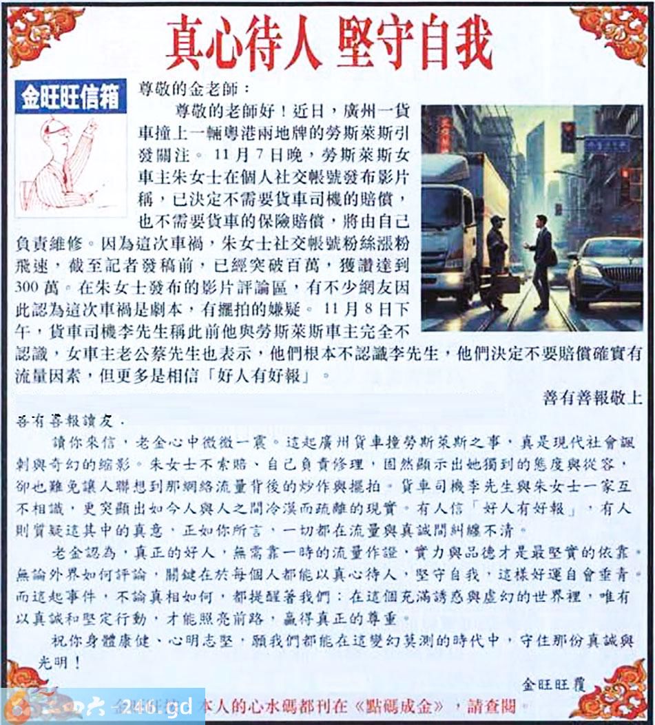 076期:金旺旺信箱彩民推荐→→《真心待人 堅守自我》