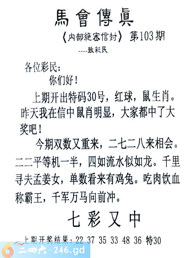 103期:首发推荐:≮馬會傳眞≯→(香港正版)