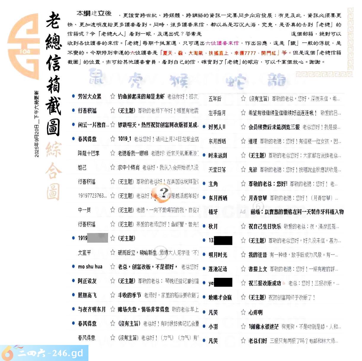 104期:六合皇金句/老总论码/萧公子/林大师/五行夺码/老总信箱截图