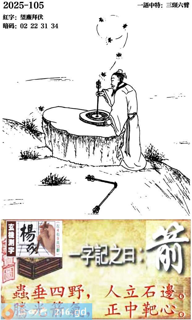 105期跑狗一字記之曰:【箭】 蟲垂四野,人立石邊。 騰光箭氣,正中靶心。 玄機測字:《楊》 一語中特:三頭六臂