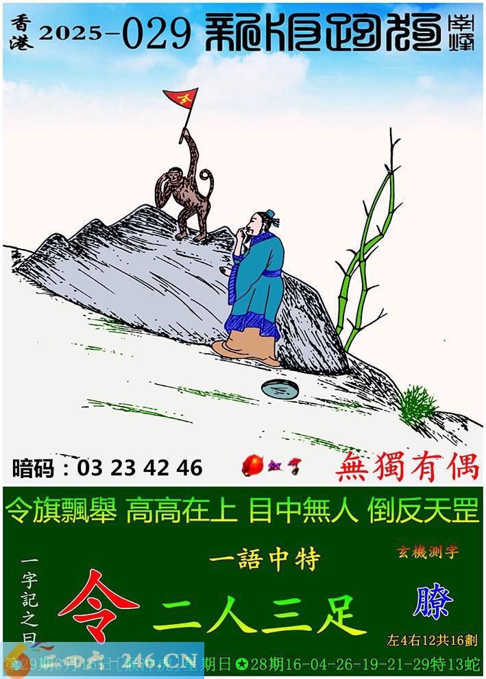 029期跑狗一字記之曰:【令】 令旗飄舉,高高在上。 目中無人,倒反天罡。 玄機測字:《膫》 一語中特:二人三足