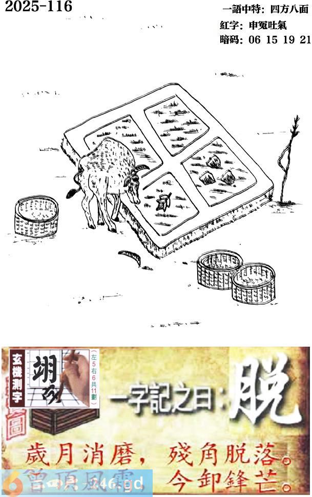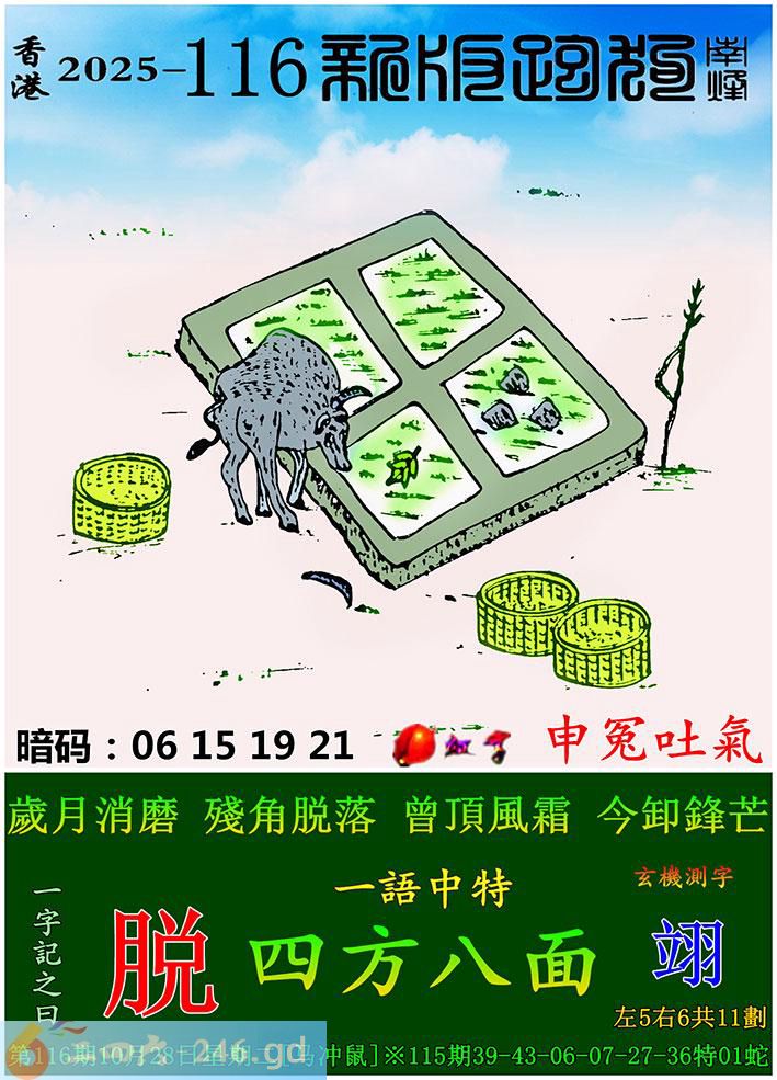116期跑狗一字記之曰:【脱】 歲月消磨,殘角脱落。 曾頂風霜,今卸鋒芒。 玄機測字:《翊》 一語中特:四方八面