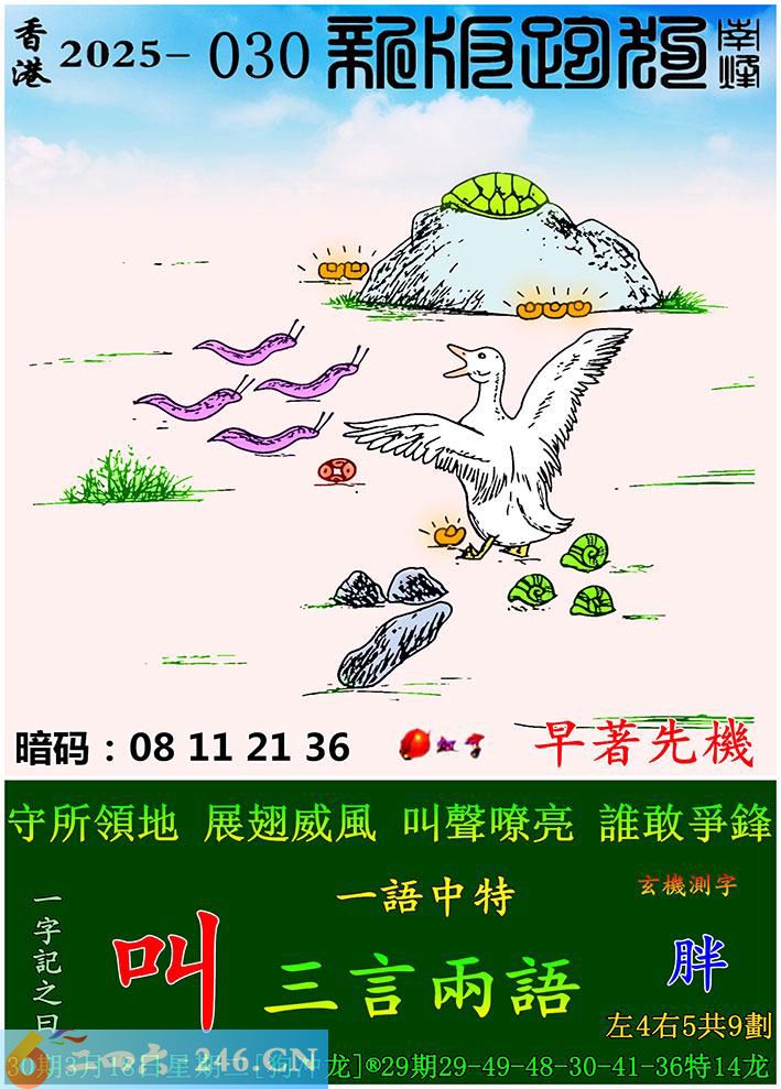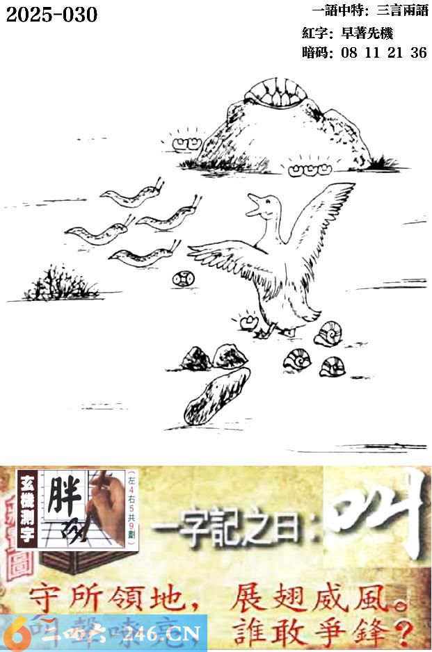 030期跑狗一字記之曰:【叫】 守所領地,展翅威風。 叫聲嘹亮,誰敢爭鋒? 玄機測字:《胖》 一語中特:三言兩語