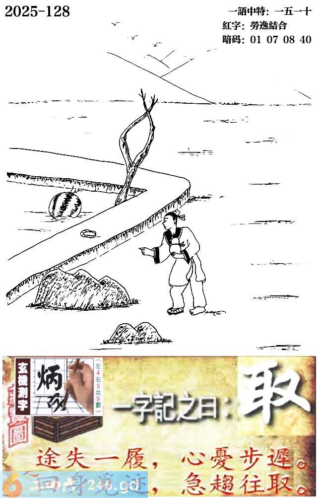 128期跑狗一字記之曰:【取】 途失壹履,心憂步遲。 回身覓跡,急趨往取。 玄機測字:《炳》 一語中特:一五一十