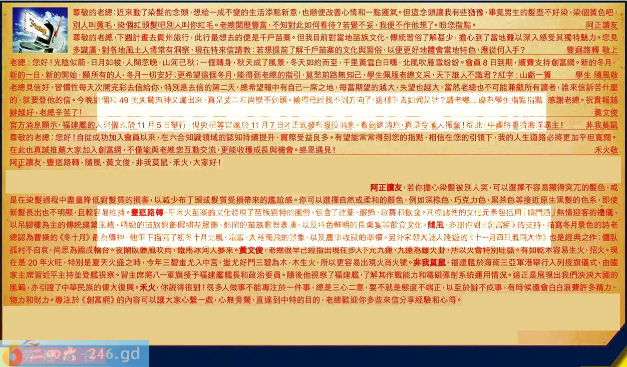 第128期《六合皇信箱文字版》10000%正確!!!正版二四六論壇*精心製作!!! 阿正讀友、豐迴路轉、隨風、黃文俊、非我莫鼠、禾火,大家好! 【1】.尊敬的老總:近來動了染髪的念頭,想給一成不變的生活添點新意,也順便改善心情和一點運氣。但這念頭讓我有些猶豫,畢竟男生的爱型不好染,染個黃色吧,別人叫黃毛,染個紅頭髪吧別人叫你紅毛。老總閱歷豐富,不知對此如何看待?若覺不妥,我便不作他想了。盼您指點。阿正讀友 〖阿正讀友〗:若你擔心染髪被別人笑,可以選擇不容易顯得突兀的髪色,或是在染髪過程中盡量降低對髪質的損害,以減少布丁頭或髪質受損帶來的尷尬感。你可以選擇自然或柔和的顏色,例如深棕色、巧克力色、黑茶色等接近原生黑髪的色系,即使新髪長出也不明顯,且較容易維持。 【2】.尊敬的老總,下週計畫去貴州旅行,此行最想去的便是千戶苗寨。但我目前對當地苗族文化、傳統習俗了解甚少,擔心到了當地難以深入感受其獨特魅力。您見多識廣,對各地風土人情常有洞察,現在特來信請教:若想提前了解千戶苗寨的文化與習俗,以便更好地體會當地特色,應從何入手?豐迴路轉敬上 〖豐迴路轉〗:千禾火苗寒的文化體現了苗族獨特的風俗,包含了建築、服飾、歌舞和飲食。其標誌住的文化元素包括用「擱門酒」熱情迎客的禮儀、以吊腳樓為主的傳統建築風格、精紋的苗族銀飾與繡花服飾、熱鬧的苗族歌舞表演、以及特色鮮明的長桌宴等飲食文化。 【3】.老總:您好!光陰似箭,日月如梭,人間忽晚,山河已秋;一個轉身,秋天成了風景,冬天如約而至,千里黃雲白日曛,北風吹雁雪紛紛。會員8日到期,續費支持創富網。新的冬月,新的一日,新的開始,願所有的人,冬月一切安好;更希望這個冬月,能得到老總的指引,莫愁前路無知己,學生佩服老總文采,天下誰人不識君?紅字:山虧一簧學生隨風敬 〖隨風〗:多謝你對《創富網》的支持,描寫冬月景色的詩老總認為曹操的《冬十月》最為傳神,他筆下描寫了初冬十月北風、霜雪、大雁南飛的景象,以及農事收藏的準備。另外宋朝大詩人陸遊的《十一月四日風雨大作》也是經典之作:僵臥孤村不自哀,尚思為國戍輪台。夜闌臥聽風吹雨,鐵馬冰河入夢來。 【4】.老總見信好,習慣性每天次開完彩去信給你:特別是去信的第二天,總希望報中有自己席之地,每當期望的越大,失望也越大,當然老總也不可能兼顧所有讀者,誰來信訴苦什麼的,就要登他的信。今晚這個和49號失驚無神又蹦出來,真是丈二和尚摸不到頭。輪得已經找不到方向了,這樣下去如何是號?請老總上座為學生指點指點,感謝老總。祝貴報越辦越好,老總辛苦了!黄文俊 〖黃文俊〗:老總很早已經指出現在步入下元九運,九運為離火卦,所以火會特別旺盛。有如乾木容易生火招火。現在是20年火旺,特別是夏天火盛之時,今年三碧蚩尤入中宫,蚩尤好鬥三碧為木,木生火,所以更容易出現火肖火號。 【5】.官方消息顯示,福建艦的入列儀式於11月5日舉行,但央視等官媒於11月7日才正式發布服役消息。看到這消息,真是令國人振奮!從此中國將重拾海洋霸主!非我莫鼠 〖非我莫鼠〗:福建艦於海南三亞軍港舉行入列授旗儀式,由國家主席習近平主持並登艦視察。習主席將八一軍旗授予福建艦艦長和政治委員。隨後他視察了福建艦,了解其作戰能力和電磁彈射系統運用情況。這正是展現出我們決決大國的風範,亦引證了中華民族的偉大復興。 【6】.尊敬的老總:您好!自從成功加入會員以來,在六合知識領域的認知持續提升,實際受益良多。有望能常常得到您的指點,相信在您的引領下,我的人生道路必將更加平坦寬闊。在此也真誠推薦大家加入創富網,不僅能與老總您互動交流,更能收穫成長與機會。感恩遇見!禾火敬 〖禾火〗:你說得很對!很多人做事不能專注於一件事,總是三心二意,要不就是態度不端正,以至於辦不成事,有時候還會白白浪費許多精力、物力和財力。專注於《創富網》的內容可以讓大家心繫一處,心無旁騖,直達到中特的目的,老總歡迎你多些來信分享經驗和心得。 紅字:勞逸結合 暗码:01070840 [释义]指工作与休息相结合。 [出处]出自邓小平《关于科学和教育工作的几点意见》。