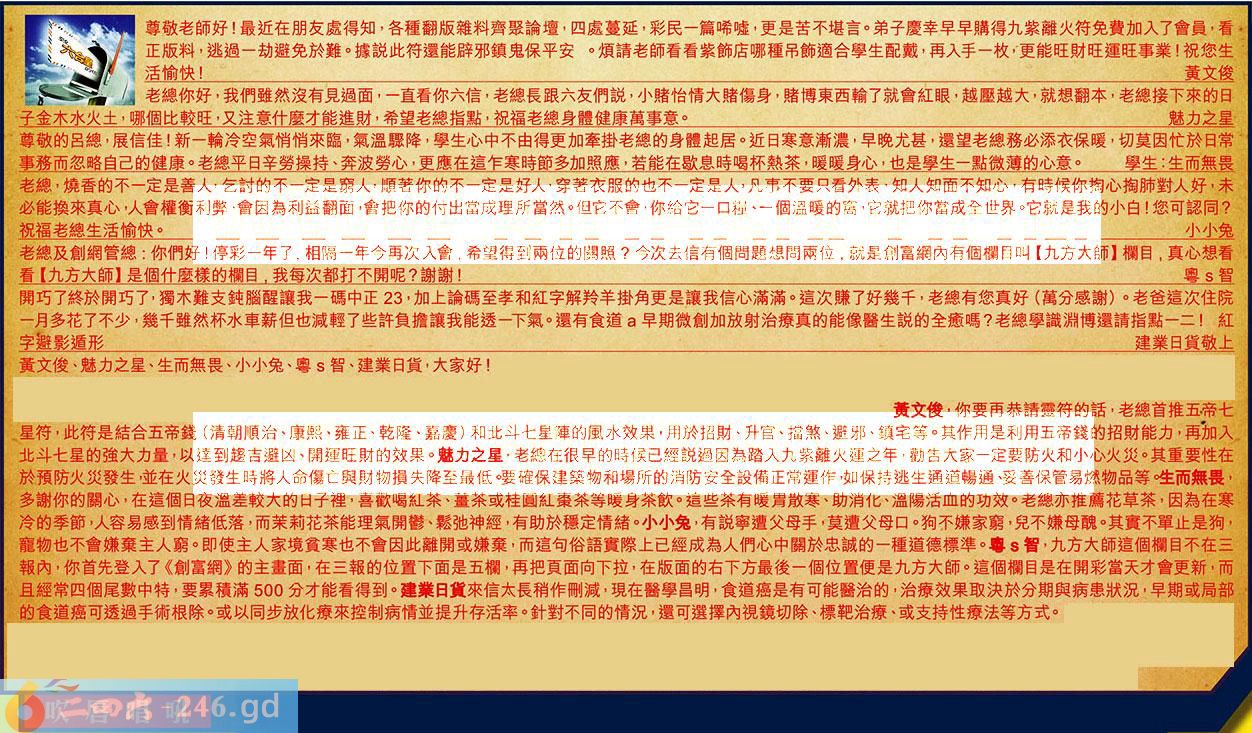 第130期《六合皇信箱文字版》10000%正確!!!正版二四六論壇*精心製作!!! 黄文俊、魅力之星、生而無畏、小小兔、粤智、建業日貨,大家好! 【1】.尊敬老師好!最近在朋友處得知,各種翻版雜料齊聚論壇,四處蔓延,彩民一篇唏噓,更是苦不堪言。弟子慶幸早早購得九紫離火符免费加入了會員,看正版料,逃過一劫避免於難。據說此符還能辟邪鎮鬼保平安。煩請老師看看紫飾店哪種吊飾適合學生配戴,再入手一枚,更能旺財旺運旺事業!祝您生活愉快!黄文俊 〖黃文俊〗:你要再恭請靈符的話,老總首推五帝七星符,此符是結合五帝錢(清朝順治、康熙、雍正、乾隆、嘉慶)和北斗七星陣的風水效果,用於招財、升官、擋煞、避邪、鎮宅等。其作用是利用五帝錢的招財能力,再加入北斗七星的強大力量,以達到趨吉避凶、開運旺財的效果。 【2】.老總你好,我們雖然沒有見過面,一直看你六信,老總長跟六友們說,小賭怡情大賭傷身,賭博東西輸了就會紅眼,越壓越大,就想翻本,老總接下來的日子金木水火土,哪個比較旺,又注意什麼才能進財,希望老總指點,祝福老總身體健康萬事意。魅力之星 〖魅力之星〗:老總在很早的時候已經說過因為踏入九紫離火運之年,勸告大家一定要防火和小心火災。其重要性在於預防火災發生,並在火災發生時將人命傷亡與財物損失降至最低。要確保建築物和場所的消防安全設備正常運作,如保持逃生通道暢通、妥善保管易燃物品等。 【3】.尊敬的呂總,展信佳!新一輪冷空氣悄悄來臨,氣溫驟降,學生心中不由得更加牽掛老總的身體起居。近日寒意漸濃,早晚尤甚,還望老總務必添衣保暖,切莫因忙於日常事務而忽略自己的健康。老總平日辛勞操持、奔波勞心,更應在這乍寒時節多加照應,若能在歇息時喝杯熱茶,暖暖身心,也是學生一點微薄的心意。學生:生而無畏 〖生而無畏〗:多謝你的關心,在這個日夜溫差較大的日子裡,喜歡喝紅茶、薑茶或桂圓紅棗茶等暖身茶飲。這些茶有暖胃散寒、助消化、溫陽活血的功效。老總亦推薦花草茶,因為在寒冷的季節,人容易感到情緒低落,而茉莉花茶能理氣開鬱、鬆弛神經,有助於穩定情緒。 【4】.老總,燒香的不一定是善人,乞討的不一定是窮人,順著你的不一定是好人,穿著衣服的也不一定是人,凡事不要只看外表,知人知面不知心,有時候你掏心掏肺對人好,未必能换來真心,人會權衡利弊,會因為利益翻面,會把你的付出當成理所當然。但它不會,你給它一口糧、一個溫暖的窩,它就把你當成全世界。它就是我的小白!您可認同?祝福老總生活愉快。小小兔 〖小小兔〗:有說寧遭父母手,莫遭父母口。狗不嫌家窮,兒不嫌母醜。其實不單止是狗,寵物也不會嫌棄主人窮。即使主人家境貧寒也不會因此離開或嫌棄,而這句俗語實際上已經成為人們心中關於忠誠的一種道德標準。 【5】.老總及創網管總:你們好!停彩一年了,相隔一年今再次入會,希望得到兩位的關照?今次去信有個間題想問兩位,就是創富網內有個欄目叫【九方太師】欄目,真心想看看【九方大師】是個什麼樣的欄目,我每次都打不開呢?謝謝!粤智 〖粵智〗:九方大師這個欄目不在三報內,你首先登入了《創富網》的主畫面,在三報的位置下面是五欄,再把頁面向下拉,在版面的右下方最後一個位置便是九方大師。這個欄目是在開彩當天才會更新,而且經常四個尾數中特,要累積滿500分才能看得到。 【6】.開巧了終於開巧了,獨木難支鈍腦醒讓我一碼中正23,加上論碼至孝和紅字解羚羊掛角更是讓我信心滿滿。這次賺了好幾千,老總有您真好(萬分感謝)。老爸這次住院一月多花了不少,幾千雖然杯水車薪但也減輕了些許負撸讓我能透一下氣。還有食道早期微創加放射治療真的能像醫生說的全癒嗎?老總學識淵博還請指點一二!紅字避影遁形建業日貨敬上 〖建業日貨〗:來信太長稍作刪減,現在醫學昌明,食道癌是有可能醫治的,治療效果取決於分期與病患狀況,早期或局部的食道癌可透過手術根除。或以同步放化療來控制病情並提升存活率。針對不同的情況,還可選擇內視鏡切除、標靶治療、或支持性療法等方式。 紅字:吹脣唱吼 暗码:15214649 [释义]形容喧闹喊叫。 [出处]《南史·侯景传》:“丑徒数万,同共吹唇唱吼而上。”