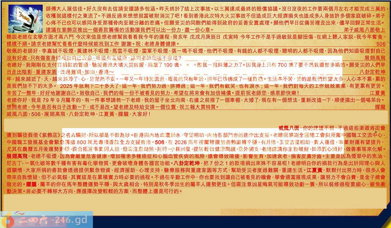 第133期《六合皇信箱文字版》10000%正確!!!正版二四六論壇*精心製作!!! 威風八面、506、展翅高飛、八卦定乾坤、江夏黃、朦朧,大家好! 【1】.師傅大人展信佳。好久沒有去信請安還請多包涵。昨天終於了結上次事故。以三萬達成最終的賠償協議。沒日沒夜的工作要兩個月左右才能完成三萬的收穫就這樣付之東流了。不過反過來想想就當破財消災了吧!看到香港此次特大火災事故不但造成巨大經濟損失也造成多人身故許多個家庭破碎。弟子心疼不已也可以感同身受那種骨肉至親分離的悲痛。但願受災的同胞們能得到政府的妥善安置處理。願他們早日從痛苦裡走出來,贐早回歸正常生活。建議在紫飾店推出一個善款籌備的活動讓我們可以出一份力,盡二份心意。弟子威風八面敬上 〖威風八面〗:你的建議不錯,不過這些渠道肯定會遭到騙徒假借《紫飾店》之名去騙財,所以都是不做為妙。香港與內地血濃於水守望相助,內地各部門也迅速作出支援。老總很感謝全國總工會與所屬中國職工交流中心、中國職工發展基金會緊急籌措800萬元專項善款全力支援香港。 【2】.聽說老總在玄學方面才高八鬥今次來信是想老總幫我看看我今年的運程,癸亥年戊戍月庚辰日戊寅時今年工作不是手過敏就是腳扭傷,在網上聽人家說,我今年奪食,樣樣不順。請求老總幫忙看看什麼時候能找到工作謝謝。祝:老總身體健康。506 〖506〗:在2026馬年裡屬豬運勢由動盪轉平穩,有月德、玉堂吉星相助,貴人運佳,事業財運有望提升,尤其在農曆五月後運勢更穩,適合拓展事業與人脈,但需注意劫煞、死符、小耗凶星,提防輕微健康問題、意外開支,老總建議你主動破財,如添置心頭好、做善事等來化解。 【3】.敬佩的老師好,李嘉誠不吸煙,黃建林不吸煙,馬雲不吸煙,雷軍不吸煙,張一鳴不吸煙,他們不吸煙,有錢的人都不吸煙,聰明的人都不吸煙,因為他們知道吸煙對自己沒有好處,只有傷害身體縮短自己壽命,吸煙有害健康,請問老師您吸不吸煙?展翅高飛 〖展翅高飛〗:老總不吸煙,因為會嚴重危害健康,增加罹患多種癌症和心腦血管疾病的風險,還會導致陽痿、影響生育、加速衰老、損害皮膚牙齒。主要是因為煙草中的焦油尼古丁、一氧化碳等數千種有害有毒化學物質,更會破壞身體各器官功能。 【4】.老總好,我剛剛在支付寶捐款的管道,馳援香港大埔火災救援,捐獻了100塊。。盡我一點綿薄之力了。因我身上只有700塊了要不然我還想多娟的。願受災的人們早日走出陰影,重建家園,渡過難關加油,香港八卦定乾坤 〖八卦定乾坤〗:把7份之1的款項捐出來殊不容易呢!老總明白你的捐款行為是出於同理心與人道關懷,大家所捐的善款會透過提供緊急物資、經濟援助、心理支持、醫療服務與重建家園等方式,幫助受災者度過難闢,重建生活。 【5】.年,越來越近了,天,越來越冷了,心,茫茫然不安。一年又一年時光流逝增長的只有年齡,過年已彷佛成了一種負擔。生活本不苦,苦的是我們懇望太多,人心本不累,累的是我們放不下的太多。2025年就剩下二十多天了,這一年,我們努力過,拼搏過;這一年,我們有歡笑,也有淚水;這一年,我們對每天的工作兢兢業業,有更累有更苦。辛苦了一整年,好好地謝謝自己。致敬自己,我們的每一份不被看見的努力,希望在將來會有加倍補償。提前祝老師您,感恩節快樂!江夏黄 〖江夏黃〗:默默付出努力時,很多人會帶來自我懷疑,但不必氣餒,其實這是在累積實力時必要的過程。不過在辛勤工作中,你也要找到讓自己被看見的機會,學會適當展現成果,讓努力不會白費,是金子總會發光的。 【6】.老總你好,我是79年9月屬羊的,有一件事想請教一下老總,我的屋子坐北向南,右邊之前搭了一個車棚,太矮了,現在有一個想法,重新改造一下,順便搞出一個喝茶台想問老總,今年是否有日子改動一下,或不易改。望老總及時給安排一個位置,祝三報大買特買。朦朧 〖朦朧〗:屬羊的你在馬年整體運勢平穩,與太歲相合,特別是秋冬季出生的屬羊人運勢更佳。但需注意凶星晦氣可能導致功虧一簣,所以裝修過程要細心,避免街動決策。非必要不轉移大方向,應選擇改變較輕的方案,而整體上還是可行的。 紅字:螻蟻偷生 暗码:02313341 [释义]比喻一个人要能爱惜生命,不可轻生。
