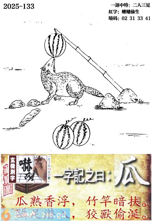 133期跑狗一字記之曰:【瓜】 瓜熟香浮,竹竿暗扶。 躡足潛入,狡獸偷涎。 玄機測字:《嚇》 一語中特:二人三足