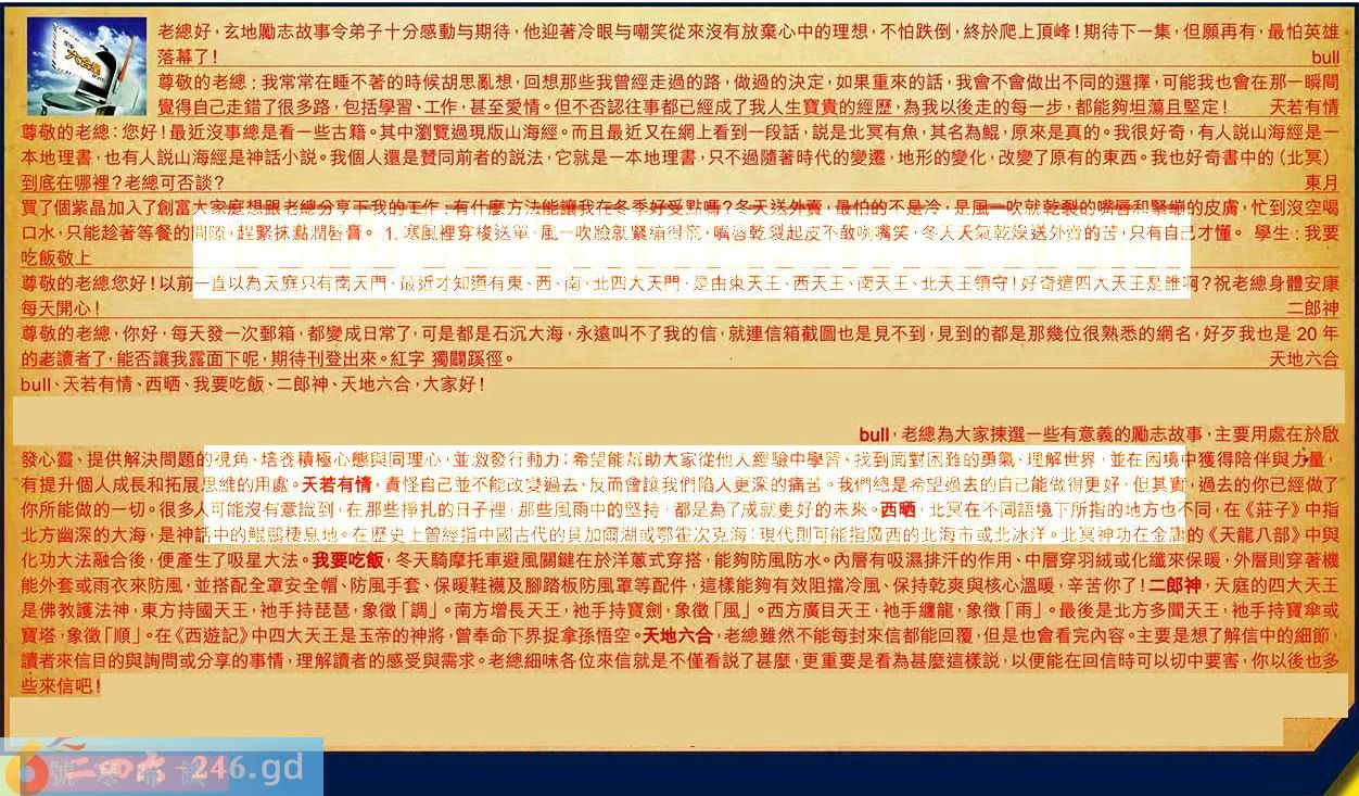 第005期《六合皇信箱文字版》10000%正確!!!正版二四六論壇*精心製作!!! 、天若有情、西晒、我要吃飯、二郎神、天地六合,大家好! 【1】.老總好,玄地勵志故事令弟子十分感動与期待,他迎著冷眼与嘲笑從來沒有放棄心中的理想,不怕跌倒,終於爬上頂峰!期待下一集,但願再有,最怕英雄落幕了! 〖〗:老總為大家揀選一些有意義的勵志故事,主要用處在於啟發心靈、提供解決問題的視角、培養積極心態與同理心並激發行動力;希望能料助大家從他人經驗中學習、找到面對困難的勇氣理解世界,並在困境中獲得陪伴與力量,有提升個人成長和拓展思維的用處。 【2】.尊敬的老總:我常常在睡不著的時候胡思亂想,回想那些我曾經走過的路,做過的決定,如果重來的話,我會不會做出不同的選擇,可能我也會在那一瞬間覺得自己走錯了很多路,包括學習、工作,甚至愛情。但不否認往事都已經成了我人生寶貴的經歷,為我以後走的每一步,都能夠坦蕩且堅定!天若有情 〖天若有情〗:責怪自己並不能改變過去。反而會讓我們陷入更深的痛苦。我們總是希望過去的自己能做得更好但其實,過去的你已經做了你所能做的一切。很多人可能沒有意識到,在那些掙扎的日子裡,那些風雨中的堅持,都是為了成就更好的未來。 【3】.敬的老總:您好!最近沒事總是看一些古籍。其中瀏覽過現版山海經。而且最近又在網上看到一段話,説是北冥有魚,其名為鯤,原來是真的。我很好奇,有人説山海經是一本地理書,也有人説山海經是神話小説。我個人還是贊同前者的説法,它就是一本地理書,只不過隨著時代的變遷,地形的變化。改變了原有的東西。我也好奇書中的(北冥)到底在哪裡?老總可否談?東月 〖西晒〗:北冥在不同語境下所指的地方也不同,在《莊子》中指北方幽深的大海,是神話中的鯤鹏棲息地。在歴史上曾經指中國古代的貝加爾湖或鄂霍次克海;現代則可能指廣西的北海市或北冰洋。北冥神功在金庸的《天龍八部》中與化功大法融合後,便產生了吸星大法。 【4】.買了個紫晶加入了創富大家庭想跟老總分享下我的工作,有什麼方法能讓我在冬季好受點嗎?冬天送外商,最怕的不是冷,是風一吹就乾裂的嘴唇和紧繃的皮膚,忙到沒空喝口水,只能趁著等餐的間隙,程聚抹點潤唇膏。1.寒風裡穿梭送單,風一吹臉就紧繃得慌,嘴唇乾裂起皮不敢咧嘴笑,冬天天氣乾燥送外賣的苦只有自己才懂。學生:我要吃飯敬上 〖我要吃飯〗:冬天騎摩托車避風關鍵在於洋蒽式穿搭,能夠防風防水。内層有吸濕排汗的作用、中層穿羽絨或化纖來保暖,外層則穿著機能外套或雨衣來防風,並搭配全罩安全帽、防風手套、保暖鞋襪及腳踏板防風罩等配件,這樣能夠有效阻擋泠冷風、保持乾爽與核心溫暖,辛苦你了! 【5】.尊敬的老總您好!以前一直以為天庭只有南天門,最近才知道有東、西、南北四大天門,是由東天王、西天王,南天王、北天王鎮守!好奇這四大天王是誰啊?祝老總身體安康每天開心!二郎神 〖二郎神〗:天庭的四大天王是佛教護法神,東方持國天王,袖手持琵琶,象徵「調」。南方增長天王,袖手持寶劍,象徵「風」。西方廣目天王,池手纏龍,象徵「雨」。最後是北方多聞天王,他手持寶伞或寶塔象徵「順」。在《西遊記》中四大天王是玉帝的神將,曾奉命下界捉拿孫悟空。 【6】.尊敬的老總,你好,每天發一次郵箱,都變成日常了,可是都是石沉大海,永遠叫不了我的信,就連信箱截圖也是見不到,見到的都是那幾位很熟悉的網名,好歹我也是20年的老讀者了,能否讓我露面下呢,期待刊登出來。紅字獨關蹊徑。天地六合 〖天地六合〗:老總雖然不能每封來信都能回覆,但是也會看完内容。主要是想了解信中的細節,讀者來信目的與詢問或分享的事情,理解讀者的感受與需求・老總細味各位來信就是不僅看説了甚麼,更重要是看為甚麼這樣説,以便能在回信時可以切中要害,你以後也多些來信吧! 紅字:號寒啼飢 暗码:01182041 [释义]形容挨饿受冻的悲惨生活。 [出处]唐·韩愈《进学解》:“冬暖而儿号哭寒,年丰而凄啼饥。