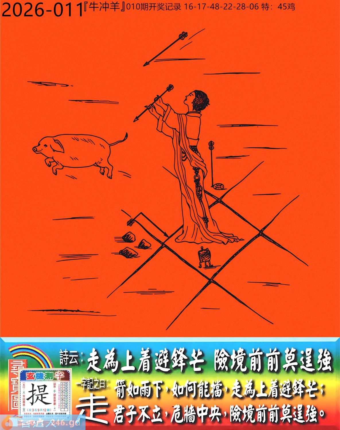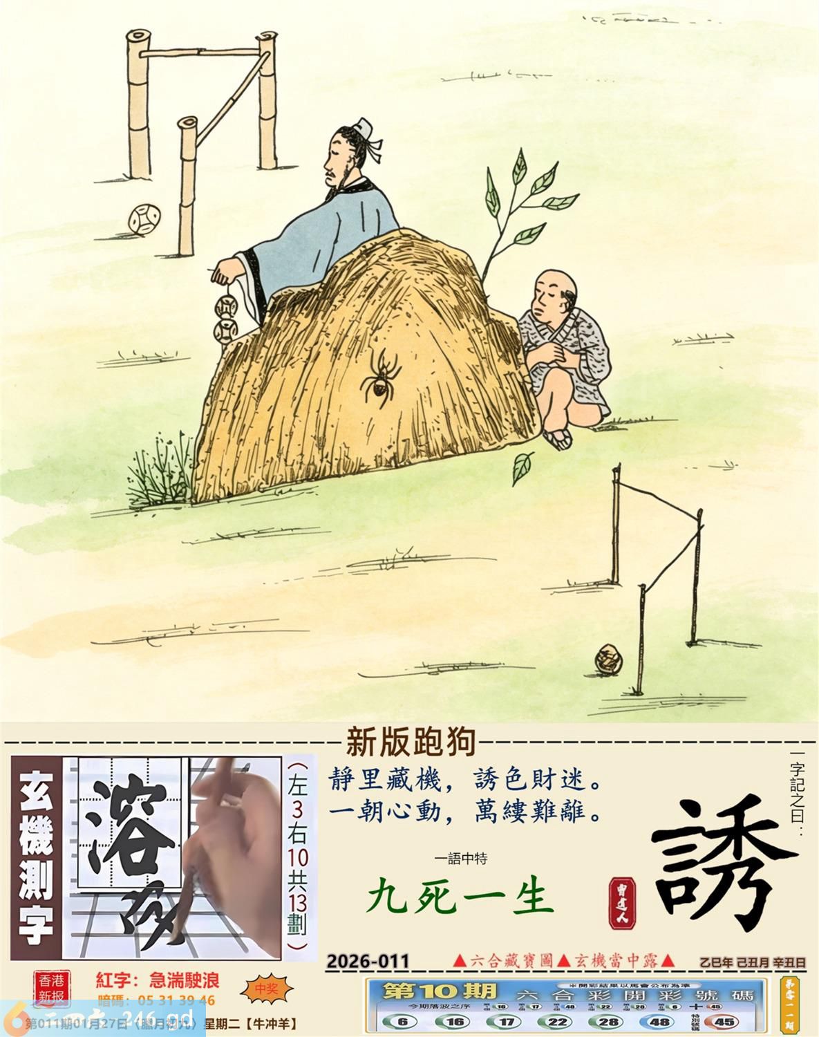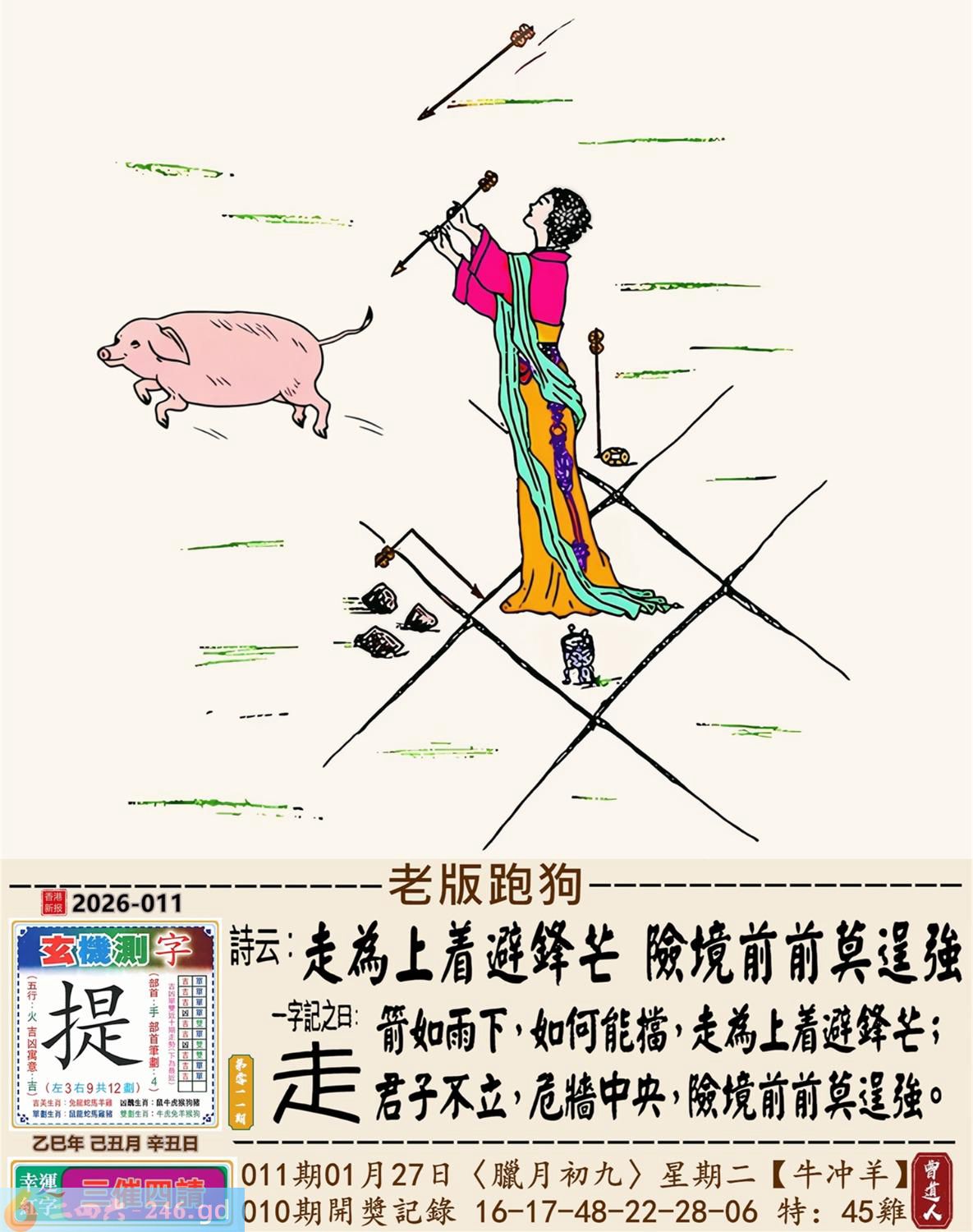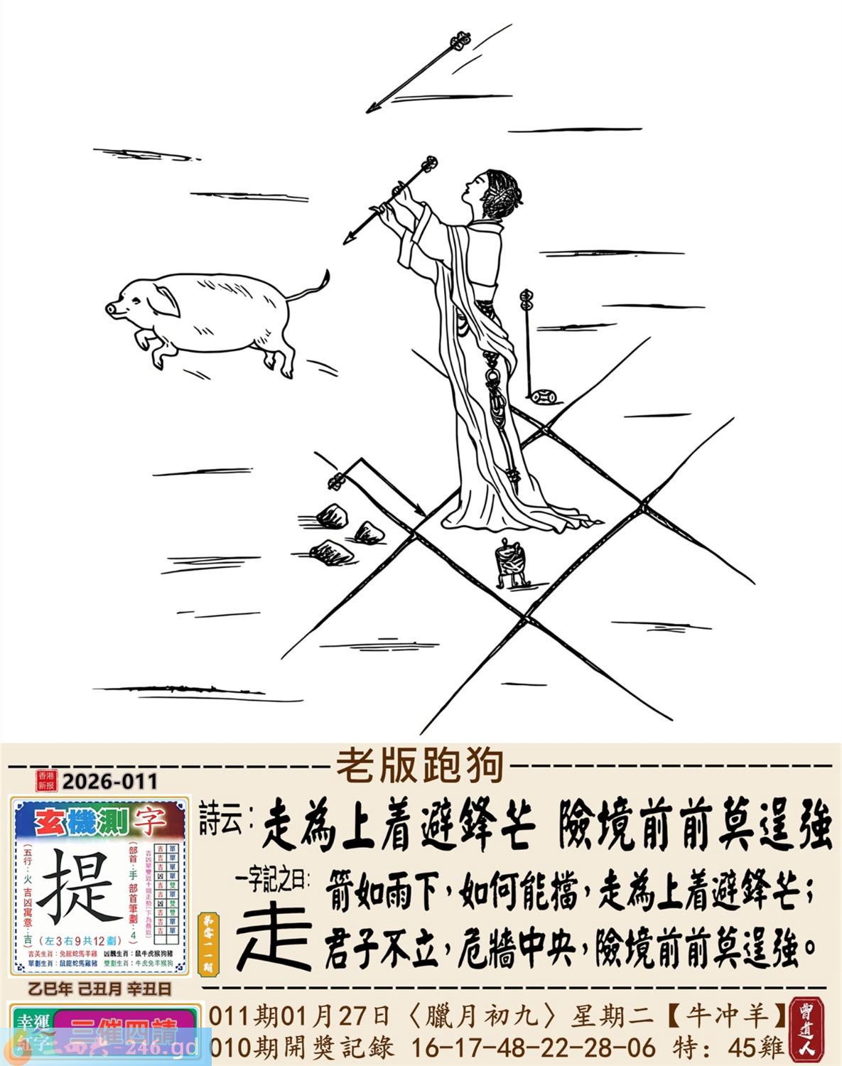 2026年1月27日011期羊(乙未)(壁上土) 011期:老版跑狗玄機一字記之曰:【走】 詩云:走為上着避鋒芒險境前前莫逞強 箭如雨下,如何能擋,走為上着避鋒芒; 君子不立,危牆中央,險境前前莫逞強。 玄機測字:《提》 密圖詩:酒足飯飽去按摩 《記》:同桌對座賽象棋 特碼大小單雙句:一窩鳥蛋有六個 今期必中:趙雲 011期:特碼歇后語 早上没刷牙-----嘴巴不干净 011期正版四字梅花诗:恕不奉陪。 011期火车头:烧伤龙。诗:鸡死猪伤,十二生肖排第四。 011期香港第一手欲钱料:龙? 011期曾道人说:“木?” 011期另版四字梅花诗:四面青山。 011期香港第一手欲钱料:欲钱找伶俐的动物。 011期曾道人说:“为什么每个人都比较喜欢钱呢”? 011期:二字經:好數 011期:电灯是特码 011期:智力金壤;一丝不挂 011期:信箱紅字:【急湍駛浪】 011期:【暗碼:05-31-39-46】 011期:一語中特:【九死一生】 發財玄機圖:冷静守候弓身嘶聲圖中明蛇紅綠 011期:藏寳圖 新:因想后湖题柱处 老:汉城黄柳映新帘 禁:虎禁:4尾玄机字《踌》 2026年011期【生活幽默】版 〖未來岳父〗 今天去女朋友家,心裏异常緊張。 晚上吃飯的時候,未来岳父多喝了兩杯,就跟我:"小李啊,我看你這人很有自信,胸懷寬廣,想必以後必成大器,女兒交給你我也就放心了。"聽得我那個高興,忙問這您也能看出來啊? 他回答道:"我瞧你長得這鳥樣,也敢泡我女兒,説明你這人不簡單。" 我......
