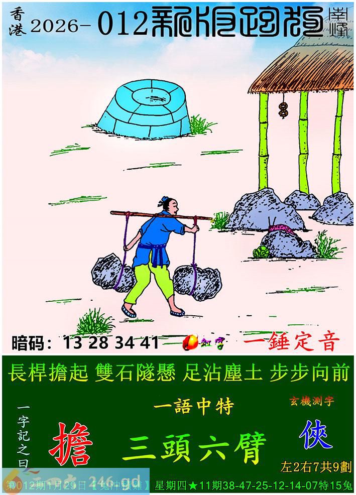 012期跑狗一字記之曰:【擔】 長桿擔起,雙石隧懸。 足沾塵土,步步向前。 玄機測字:《俠》 一語中特:三頭六臂