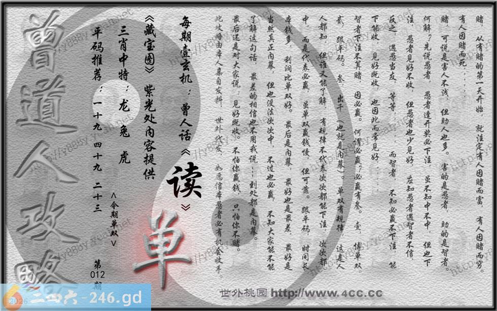 012期藏寶圖 新:家在画桥堤下住 老:古来帷有酒偏香 禁:猴禁:9尾玄機字:《读》