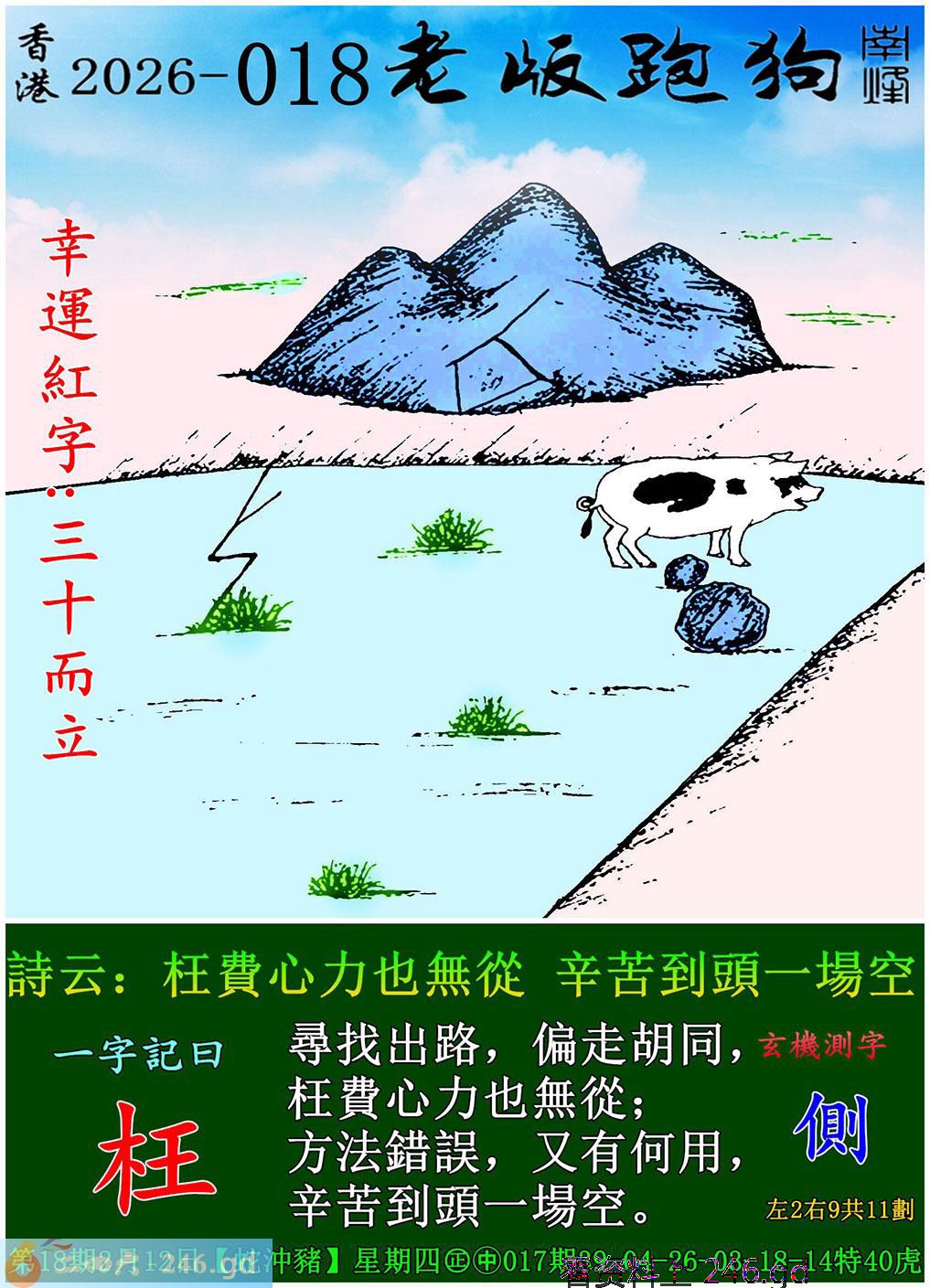 本帖最后由期望于2026-2-1220:21编辑 018期老版跑狗一字記之曰:【枉】 詩雲:枉費心力也無從,辛苦到頭一場空。 尋找出路,偏走胡同,枉費心力也無從; 方法錯誤,又有何用,辛苦到頭一場空。 玄機測字:《側》
