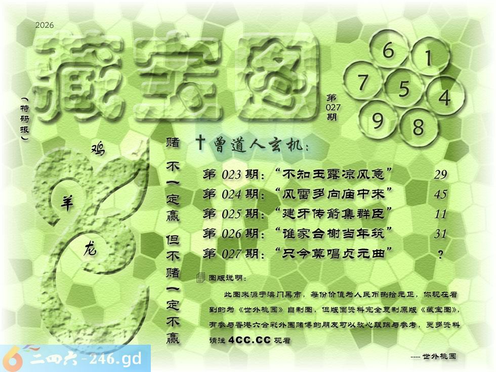 027期藏寶圖 新:只今莫唱贞元曲 老:悄立市桥人不识 禁:蛇 禁:2尾 玄機字:《莼》