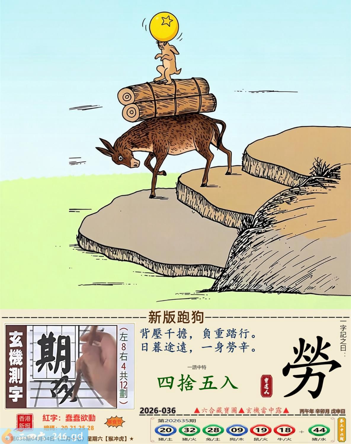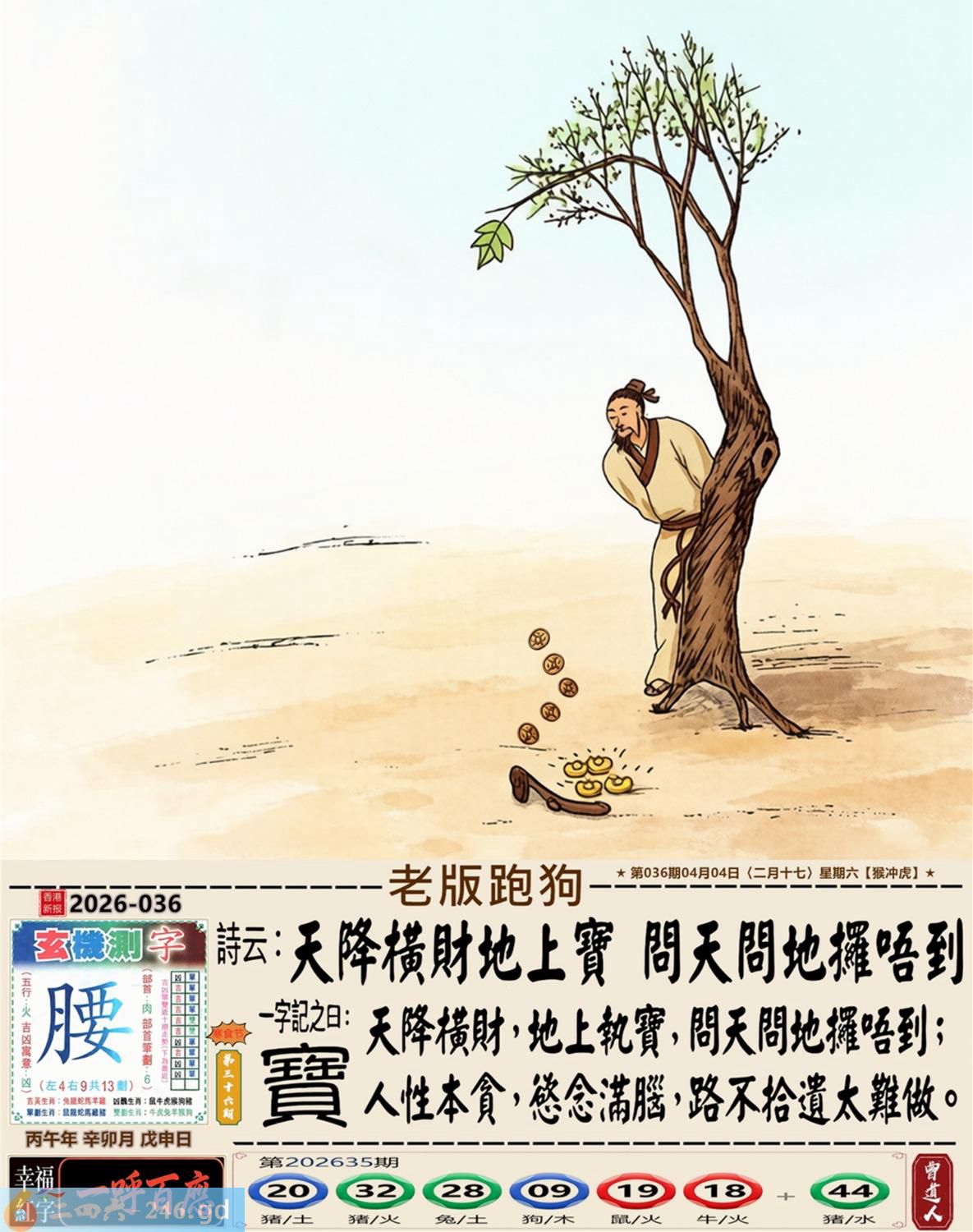 2026年4月4日二月十七星期六大驿土猴日冲虎 036期:老版跑狗玄機一字記之曰:【寶】 詩云:天降橫財地上寶,問天問地擺唔到。 天降橫財,地上執寶,問天問地擺唔到; 人性本貪,念滿腦,路不拾遺太難做。 玄機測字:《腰》 密圖詩:打開大門迎財神 記:八仙過海顯蛇兔 特碼大小單雙句:天涯海角 今期必中:劉協 036期:特碼歇后語 能字添四点-----熊样 036期正版四字梅花诗:四月四日。 036期火车头:烧伤马。诗:虎死鸡伤,三九看数一味真。 036期香港第一手欲钱料:闻鸡起舞。 036期曾道人说:“大?” 036期另版四字梅花诗:一个和尚。 036期香港第一手欲钱料:欲钱看脚小头大的动物。 036期曾道人说:“为什么女人疯狂的时候像头狼”? 036期二字经:绿红。 036期:五叶神是特码 036期智力金壤:天昏地暗 036期信箱紅字:【鍥而不舍】 036期【暗碼:16-19-20-47】 036期一語中特:【四捨五入】 發財玄機圖:交替運動節拍連續圖中明馬藍綠 036期:藏寳圖 新:西第将军成底事 老:剑花秋莲光出匣 禁:龙禁:2尾玄机字《部》 2026年036期【生活幽默】版 〖謹遵遺言的孩子〗 爺爺在病危之際,將年少無知的孫子叫到床前,用盡最後一口氣囑咐道:“孩子啊,這個世道......做官才好啊!” 小孫子是個聽話的孩子,他將爺爺臨終前的話牢牢記在心裏。許多年以後,他終于成了村裹最好的棺材匠。