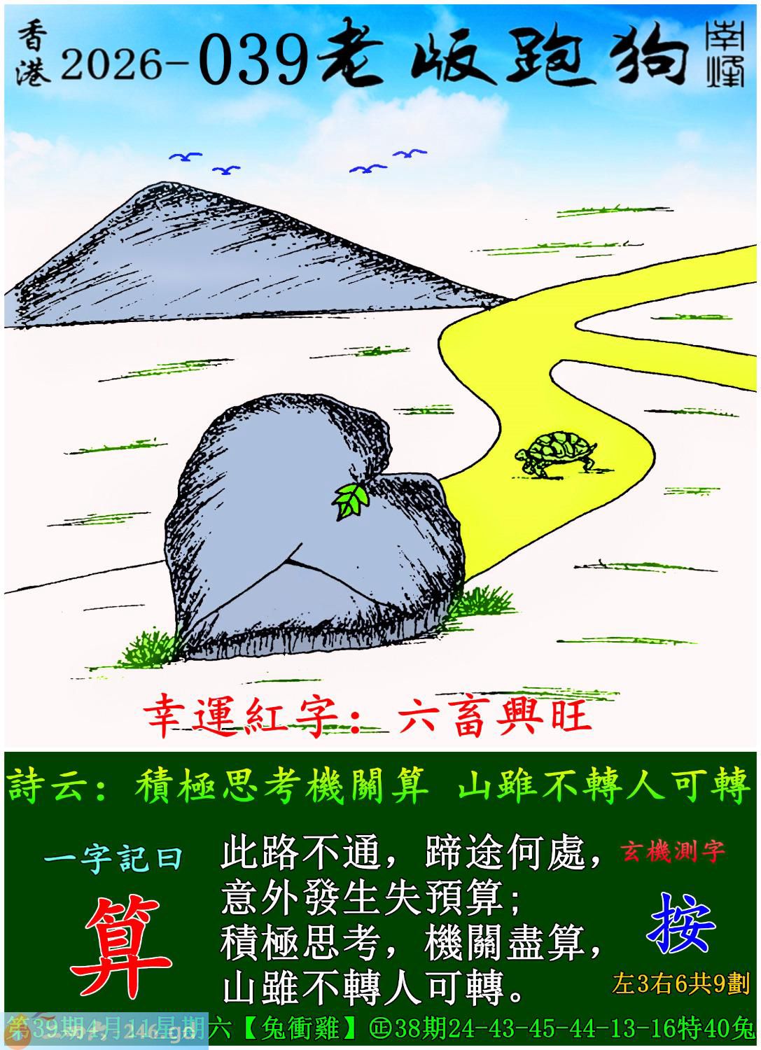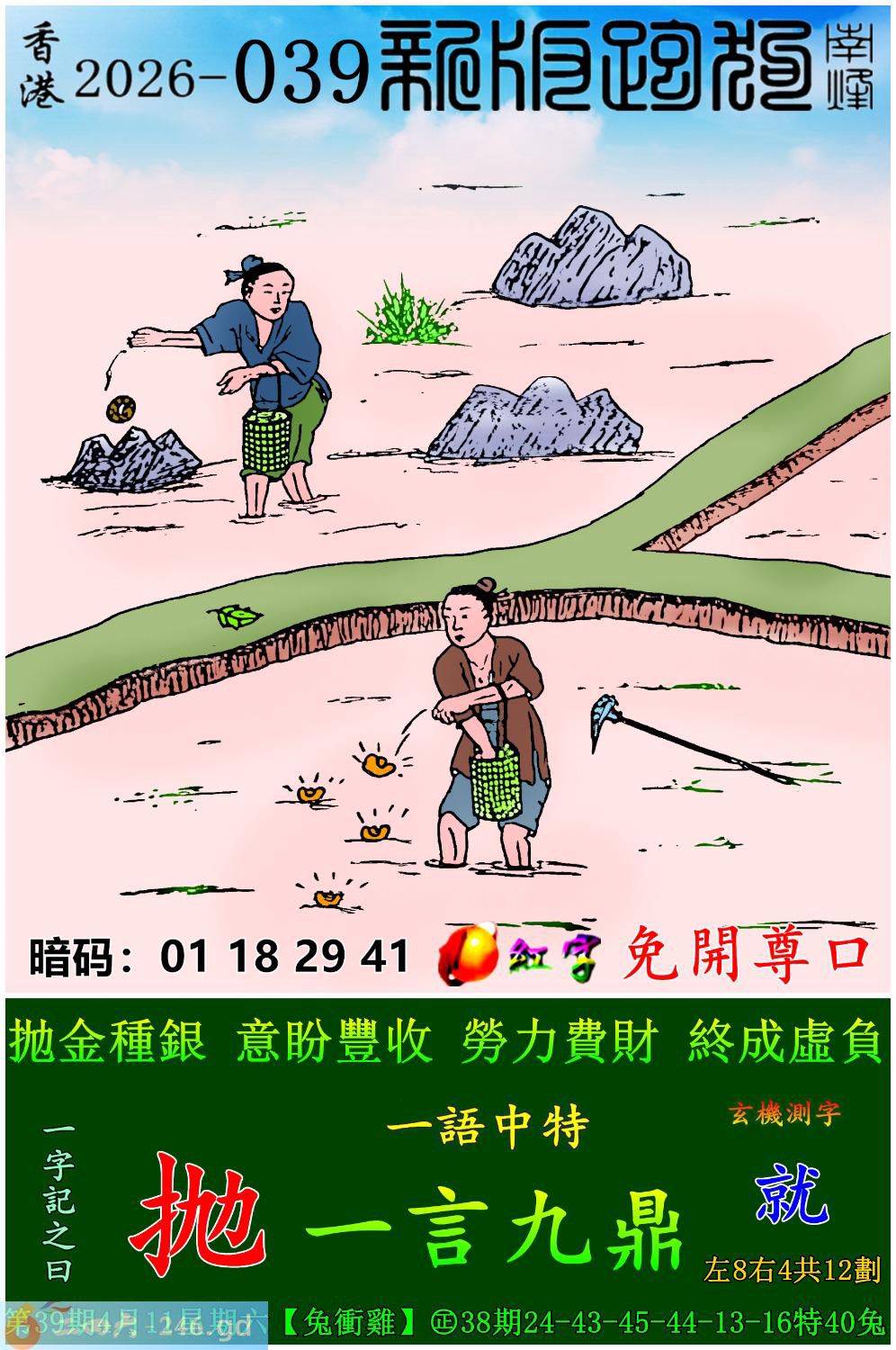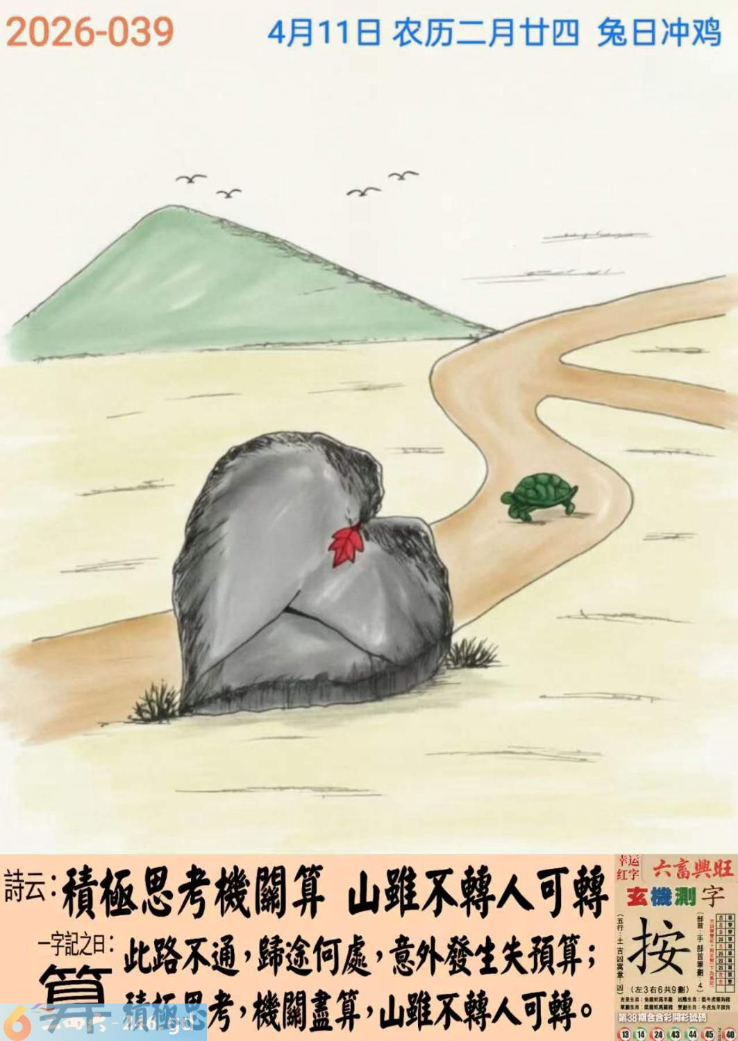 本帖最后由小歪于2026-4-1109:31编辑 2026年4月11日二月廿四星期六大溪水兔日沖雞 039期:老版跑狗玄機一字記之曰:【算】 詩云:積極思考機關算,山雖不轉人可轉。 此路不通,歸途何處,意外發生失預算; 積極思考,機關盡算,山雖不轉人可轉。 玄機測字:《按》 密圖詩:一臉懵逼買三四 記:落入平川斷其尾 特碼大小單雙句:登上寶座十二年 今期必中:馬岱 039期:特碼歇后語 雷婆找龙王谈心-----天涯海角觅知音 039期正版四字梅花诗:鸿雁传书。 039期火车头:烧伤马。诗:牛死猴伤,一六得二开三一。 039期香港第一手欲钱料:“小”。 039期曾道人说:“龙须?” 039期另版四字梅花诗:大城小爱。 039期香港第一手欲钱料:欲钱看西游记第十五回。 039期曾道人说:“为什么有的人坐车怕晕”? 039期:二字经:红绿。 039期:泥鳅是特码 039期智力金壤:愁眉苦脸 039期信箱紅字:【免開尊口】 039期【暗碼:01-18-29-41】 039期一語中特:【一言九鼎】 發財玄機圖:毛短色亮條紋細長圖中明虎紅藍 039期:藏寳圖 新:片心惆怅清平世 老:风声雷动鸣金铁 禁:猴禁:2尾玄机字《卓》 2026年039期【生活幽默】版 〖流言蜚語〗 某先生是地方上的名人。一天,他像往常一樣在書房裏例覽當日報紙,突然對妻子大聲喊道:"喂,安娜,你看到今天早報上的流言蜚語了嗎,真可笑!他們説,你收拾行装出走了。 你聽見了嗎?安娜,你在哪兒?安娜?啊!"先生對着空空的房間大喊道......