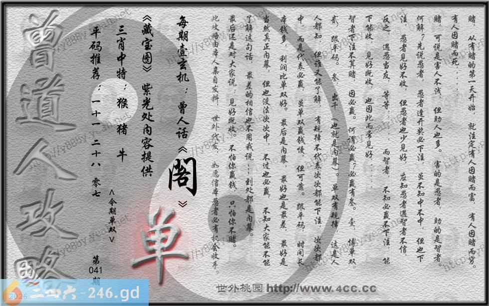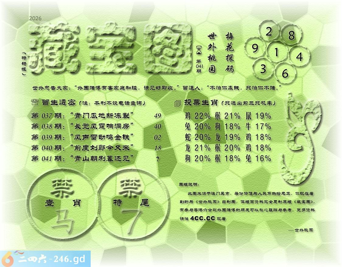 041期藏寶圖 新:江南霜重莫嫌渠 老:青山朝别暮还见 禁:马禁:7尾玄機字:《阁》