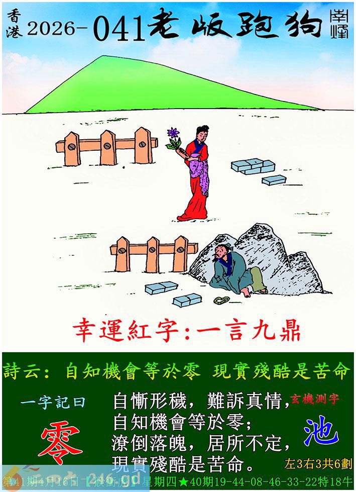 本帖最后由庞太师于2026-4-1518:20编辑 041期老版跑狗一字記之曰:【零】 詩雲:自知機會等於零,現實殘酷是苦命。 自慚形穢,難訴真情,自知機會等於零; 潦倒落魄,居所不定,現實殘酷是苦命。 玄機測字:《池》 整体诗文讲述了夫妻之间·真情无法得到释放, 远赴出征居所不定,潦倒落魄,身不由己,現實之殘酷是苦命。 如图所示:一妻家中等,夫君落魄假三后。 一言九鼎:“19火”鼠马同位。 玄机测字:【池·6画】6号元帅有亲邻“13” 一肖:马13