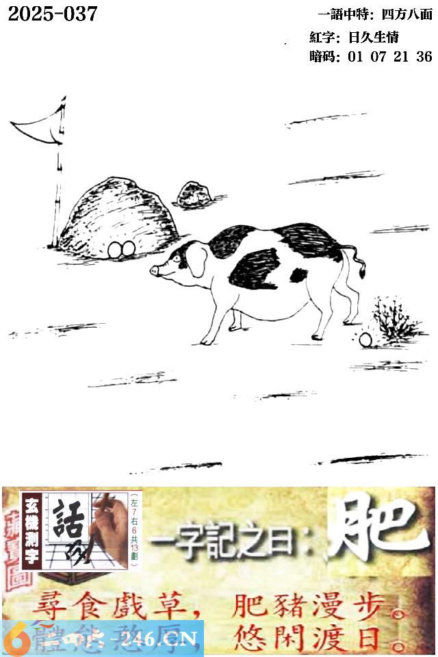 037期跑狗一字記之曰:【肥】 尋食戲草,肥豬漫步。 體態憨厚,悠閑渡日。 玄機測字:《話》 一語中特:四方八面