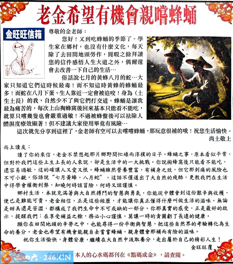 039期:金旺旺信箱彩民推荐→→《老金希望有機會親嚐蜂蛹》